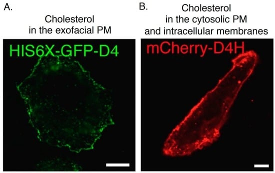 Domain 4 (D4) is a domain of PFO which size is 13 kDa and D4 is the smallest segment that is sufficient to bind to cholesterol with no cytotoxicity ([,,,]; Figure 3A). D4 associates with cholesterol in membranes through the tip of the four connecting loops and the rest of the domain does not have any contacts with the membrane []. In the recent studies, D4 and its mutants are widely used to visualize cholesterol in cellular membranes. Recombinant EGFP or mCherry-D4 proteins can visualize cholesterol in the exofacial leaflets of the PM in the living cells ([,,,,]; Figure 4A and Figure 5A). Binding of EGFP-D4 to the exofacial leaflets of the PM can be easily quantified using a flow cytometry [,], suggesting that labeling of cholesterol in the outer PM by EGFP-D4 would be suitable for high-throughput screen to identify compounds and genes, which regulate plasmalemmal localization of cholesterol in the exofacial leaflets. By labeling cholesterol in the exofacial leaflets of the PM with Dronpa-D4, cholesterol clusters in the outer PM were visualized using photoactivation localization microscopy (PALM) []. In addition to labeling in exofacial cholesterol in the PM, D4 is useful to visualize cholesterol in the cytosolic leaflets of cellular membranes by expression of mCherry-tagged D4 in cytosol in a couple of cell lines ([,]; Figure 4B). It should be emphasized that this method can distinguish transbilayer distribution of cholesterol in the PM, by addition of recombinant fluorophore-labeled D4 proteins in the medium and expression of fluorophore-labeled D4 in cytosol to visualize cholesterol in the exofacial and cytosolic leaflets of the PM, respectively ([,]; Figure 4). One issue to be considered is that D4 cannot always visualize cholesterol in the exofacial or/and cytosolic leaflets of the PM in a variety of mammalian cells because transbilayer distribution of cholesterol and its content in each leaflet of the PM seems to vary among cell lines. For example, binding of recombinant EGFP-D4 to the exofacial PM is high in Chinese hamster ovary (CHO) cells but very low in Raw cells ([]; unpublished data). Cytosolically-expressed D4 localizes at the inner PM not in CHO cells but in HeLa and MA-10 cells [,]. D4 can bind to liposomes in which cholesterol concentration is more than 30–35 mol % [,]. It is likely that cholesterol concentration in the cellular membranes which D4 cannot bind to is lower than 30 mol % and/or environments around cholesterol like phospholipids composition inhibit binding of D4 to cholesterol in the membranes. To solve this issue, a couple of novel and excellent cholesterol probes derived from D4 have been developed by introducing a variety of mutations which decrease the threshold for cholesterol-binding to D4 [,].