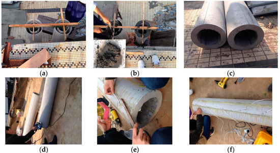Process of fiber Bragg grating (FBG) sensor package. (a) Fixed the moulds; (b) Concreting; (c) the PCC model pile; (d) Fixed and Cut; (e) Fixed-point paste; (f) Comprehensive paste.