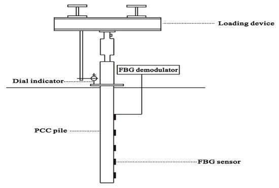 In order to obtain the deformation of the PCC pile, it is important to learn whether the bearing capacity of the PCC pile can meet the design requirement, so it is necessary to carry out the static load test for the PCC pile. There are two main experimental methods: one is the model test, and the other is the field test. Through a certain test method and monitoring method, the characteristics and laws of the PCC pile can be directly observed. For a more in-depth understanding, it can grasp the law of the PCC pile to provide a good foundation. The deformation of the pile foundation under the action of the load is difficult to obtain, and the stress state is very complex. The field static load test needs to take into account the instrument layout, the surrounding environment conditions, the loading conditions, and a series of complex problems. As such, the results cannot reflect the deformation of the pile body. The field test is not repeatable when the test data is not ideal and will waste manpower and material resources. In light of the above problems, the model test has become an indispensable part for stress and strain variations of the pile foundation in the study. Considering the application of FBG sensors to the PCC pile for the first time, in order to obtain a good strain curve of the pile body, the model test is chosen because it can accurately control the experimental condition only in this way and can avoid adverse effects of the environmental conditions of the site. Therefore, a correct analysis is needed for the PCC pile under the vertical static loading. The purpose of this experiment is mainly so that FBG technology can be applied to the monitoring of the strain of a PCC pile.