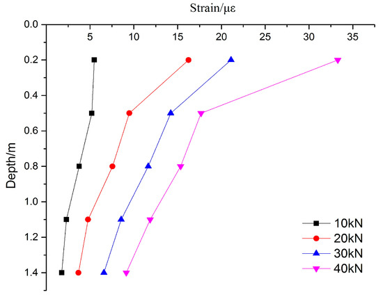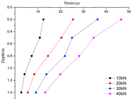 The strain of the PCC pile is monitored by FBG technology, the FBG sensors are used to monitor the deformation of the PCC pile, and the FBG sensors are arranged on the inner and outer wall of the PCC pile body. The deformation characteristics of the PCC pile can thus be more accurately analyzed. The FBG sensing fibers are used to connect the four lines of the FBG fiber sensors together. the model test is small, and the pile body is shorter with only 1.5 m. In order to ensure the survival rate of the optical fiber sensors, the single end of the layout is easy to slot and layout, and it can reduce the slotted pile body and the coated epoxy resin. This can meet the requirements of the pile body and fiber sensor. In the process of monitoring based on FBG, the effect of temperature compensation of strain on the pile is eliminated. After the completion of each loading, the FBG wavelengths are read, and the groups of wavelength change chart are obtained. Four sets of data with 10 kN, 20 kN, 30 kN, and 40 kN are selected for comparison and analysis. The results of the FBG method of the PCC pile are shown in Figure 4 and Figure 5, and the variation of strain and deformation characteristics for the PCC model pile can be seen.