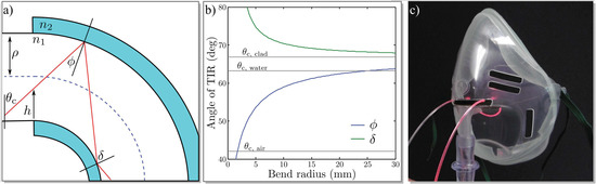 (a) Path of light inside the U-bend; (b) Angle of total internal reflection (TIR) over bend radius; (c) Photograph of the modified oxygen mask fitted with the U-bend humidity sensor.
