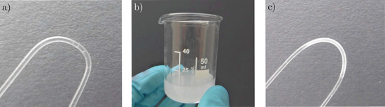 (a) The PMMA monofilament after being bent using a heat gun; (b) The poly-dimethylacrylamide (PDMAA)–ethanol solution; and (c) the coated monofilament after UV-curing.