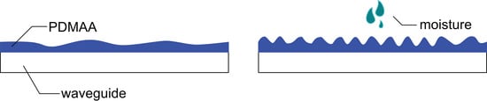 Apart from the change in refractive index, as discussed in Section 2, the influence of ambient humidity on the PDMAA coating—and thus on the transmitted light—could be determined or at least in part influenced by volumetric swelling of the cladding material. As depicted in Figure 3, a volume increase due to the absorption of water would lead to increased surface roughness of the cladding. For increasing water content, the cladding would then scatter more light, coupled into it by the evanescent field, causing an intensity drop in transmitted light at the output of the sensing region. In [2], we could identify a variation in the scattering behavior upon water absorption.