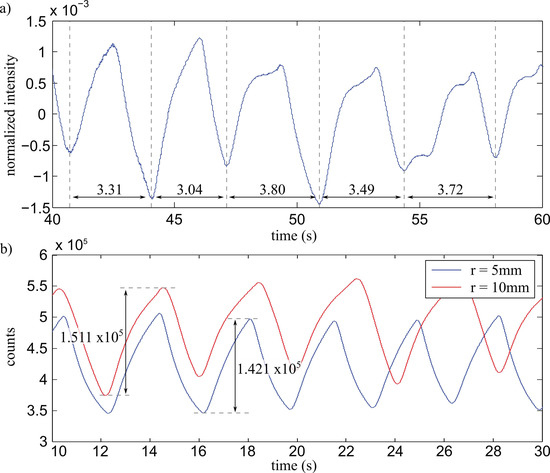 Figure 5a shows a signal with a length of 200 s of the sensor’s intensity output, measured with the person sitting idle, breathing at will through the nose or the mouth. Although the signal is irregular, there is no clear distinction possible between mouth or nose breathing, proving the feasibility of the design for monitoring both breathing cases. Figure 5b shows the detected breathing frequency with an average of ~0.25 Hz with a maximum of 0.32 Hz and a minimum of 0.16 Hz.