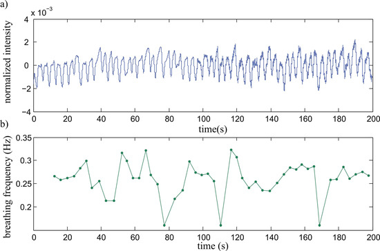 (a) Measurement data over 200 s showing regular breathing and (b) fast adaptive evaluation of the breathing frequency using an audio processing approach [18].