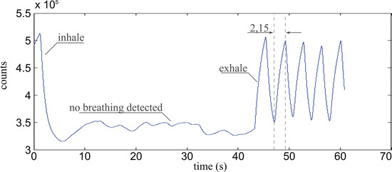 The functioning principle of the utilized approach is based on a segment-wise autocorrelation of the real-time signal. A segment of the measured signal of a certain length is stored and the correlation with the live signal is computed until a maximum is detected. The in-time difference between the current maximum and the last indicates the breathing rate. The length of the stored signal is inversely proportional to the lowest detectable frequency component.