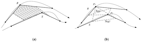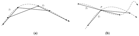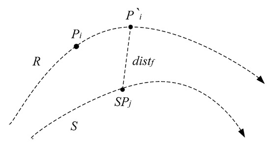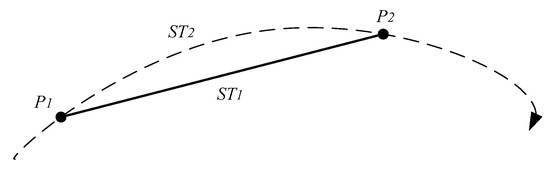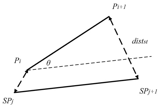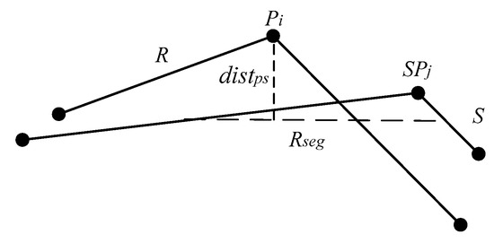 It is obvious that the distance calculation method based on the area is not an effective approach, especially for a trajectory point with a long proxy sub-trajectory, which results in a larger sum enclosed by it and other proxy trajectories. From the above analysis, the length of and shows a positive correlation with the condition of a trajectory point with a long proxy sub-trajectory. The longer a trajectory is, the worse the result is. It can adopt to convert the spatial distance between and into the sum of the distance from and , and the distance from and . That is, is the sum of point-segment distances.