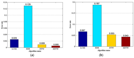 Figure 11, the algorithms with various datasets lead to various error rates, but the order of the error rate is the same. The LCSS, DTW, and SDTW can obtain good clustering results, and the EDR’s clustering effect is poor. The error rate of the SDTW is the lowest, and the error rate of LCSS is higher than that of the DTW. The error rate of the SDTW is 80%, 96.12%, and 44% lower than the LCSS, EDR, and DTW with the Cross dataset, respectively; and 35.82%, 77.01%, and 18.87% lower with the Labomni dataset, respectively. To sum up, the SDTW algorithm can obtain better accuracy than that of the DTW, LCSS, and EDR. The reason is that the SDTW algorithm introduces the prediction distance to convert the temporal distance into the spatial distance, considering the temporal distance factor. Additionally, SDTW introduces the segment-segment distance to improve the computation accuracy by adjusting the parameters of shape factors.