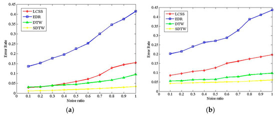 Figure 12, the maximum error rate of the LCSS, DTW, and SDTW is below 0.15 when the noise ratio varies from 0.1 to 1.0, which indicates good robustness to the noisy data for the above three algorithms. However, EDR exhibits poor performance on the robustness during the increase of noisy data.
