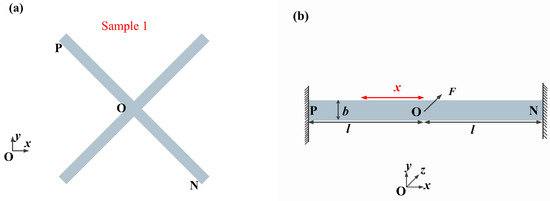 Sample 1 is the originally-designed stationary electrode as shown in Figure 1a, which includes two linear structure cantilever beams. In consideration of the geometric symmetry of the structure, it can be seen from Figure 1b that the stationary electrode can be simplified as one linear structure cantilever beam (PN) to analyze, the stiffness k of the stationary electrode in sample 1 is equal to the total sum stiffness of two linear cantilever beams (2 ). The thickness, width, and length of linear cantilever beam are h, b, and l, respectively. Both ends (P and N) of the cantilever beam is constrained to be zero, and the center point (O) is applied by a concentrated force F in z direction as shown in Figure 1b. x is in x direction along the length of cantilever beam. The total length of the cantilever beam (PN) is approximately 2l. According to the data [20], the maximum deflection of the center point O under the concentrated force F can be obtained by Equation (1):