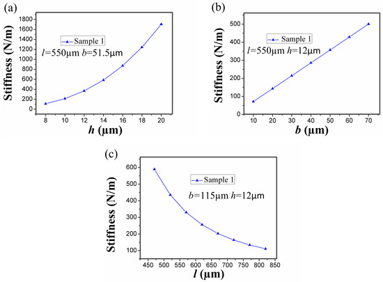 Dependence of analytical stiffness k of the stationary electrode on its geometric parameters (h, b, l): (a) the stiffness k versus the thickness h; (b) the stiffness k versus the width b; and (c) the stiffness k versus the length l.