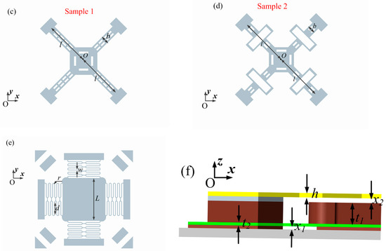 The mouth-shape crossbeam in sample 2 (see Figure 3d) is used as the stationary electrode. Considering that the calculation of deflection in sample 2 must consider more factors than the one in sample 1 because of its complicated struture, the calculated process of the analytical solution in sample 2 is very fussy and difficult. Therefore, only the analytical solution in sample 1 is provided in this paper.