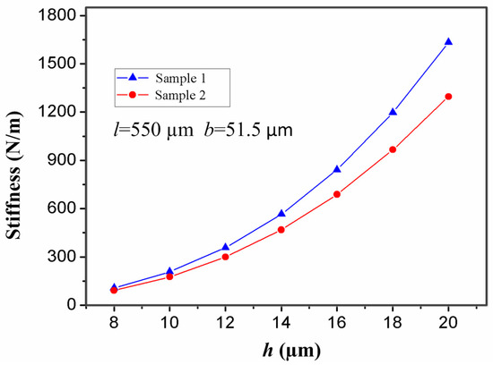 In addition, the thickness of the stationary electrode has also a great impact on the contact time. For the inertial microswitch, decreasing the thickness of the stationary electrode is a key method to extend contact duration. In order to study the impact of the thickness (h) of the stationary electrode on the contact time, the width (b) and length (l) of the stationary electrode in samples 1 and 2 are invariant and set as 51.5 µm and 550 µm, respectively. The stiffness of the two designs of elastic cross cantilever beams was simulated by ANSYS software [23]. The simulated stiffness of the stationary electrode k = can be obtained according to Hooke’s law. Figure 7 shows that the stiffness of the stationary electrode increases with the thickness, and the stiffness in sample 1 is larger than the one in sample 2 for the same thickness. When samples 1 and 2 are shocked by the same acceleration 288 g, the contact time of the inertial microswitch as a function of the thickness (h) is shown in Figure 8. The simulated results indicate that the contact time decreases with the increase of the thickness (h). That is to say, the contact time of the inertial micro-switch device decreases with the increase of the stiffness of the stationary electrode. It can be seen from the plot in Figure 8 that the contact time in sample 2 is larger than the one in sample 1 since the stiffness of the stationary electrode in sample 2 is smaller compared to the one in sample 1. It is evident that the contact time can be controlled by changing the thickness of the stationary electrode.
