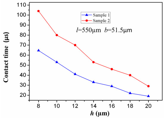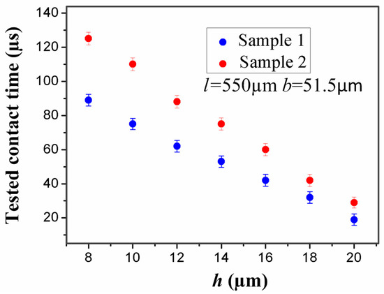 Dependence of contact time in samples 1 and 2 on the thickness (h) of the stationary electrode under the applied acceleration 288 g.