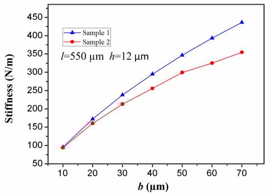 Effect of the width (b) of the stationary electrode in samples 1 and 2 on the stiffness of the stationary electrode when the thickness (b) and the length (l) of the stationary electrode are set as 12 µm and 550 µm, respectively.