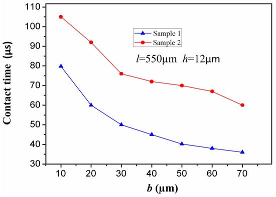 It is well known that the width (b) of the stationary electrode also has a great impact on the contact time. For the inertial micro-switch, minimizing the stiffness of the stationary electrode is a crucial way to prolong the contact time. One of the best ways to lessen the stiffness of the stationary electrode is to lessen its width (b). It can be seen from Figure 9 that the stiffness of the stationary electrode increases with the width (b). Figure 10 shows the contact time-width (b) curves of samples 1 and 2 under the applied acceleration 288 g. The contact time in samples 1 and 2 decreases with the increase of the width (b) of the stationary electrode. That is to say, the contact time decreases with the increase of the stiffness of the stationary electrode. It is evident that the contact time can be controlled by changing the width (b) of the stationary electrode. It can be seen from Figure 10 that the contact time in sample 2 is larger than the one in sample 1 since the stiffness of the stationary electrode in sample 2 is smaller.