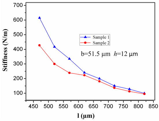 Effect of the length (l) of the stationary electrode on its stiffness when the width (b) and the thickness (h) of the stationary electrode are 51.5 µm and 12 µm, respectively.