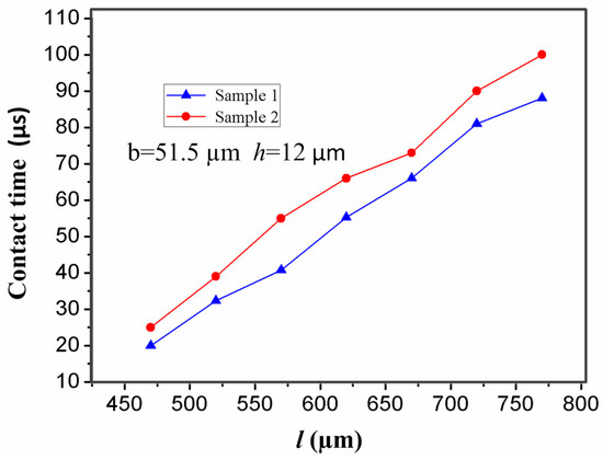 For a microswitch device, length (l) of the stationary electrode is a key factor affecting the contact time of the inertial micro-switch. In the designed inertial microswitch, samples 1 and 2 have the same geometric parameters (h, b) of the stationary electrode, but length (l) is variable. Figure 11 shows the stiffness-length curves of the stationary electrode in samples 1 and 2 under the acceleration 288 g. It can be seen that the stiffness of the stationary electrode decreases as the length increases. At the same time, Figure 12 shows that the contact time increases with the length of the stationary electrode. It can be seen from Figure 12 that the contact time in sample 2 is larger than the one in sample 1, since the softer the stationary electrode is, the longer the contact time is. However, overly large dimensions of length are not a satisfactory choice since the dimension of the whole microswitch cannot be too large, considering the miniature structure design.