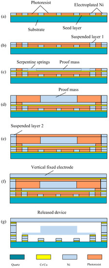 The prototype of the vertically-driven inertial microswitch was fabricated by low-cost nickel-electroplating technology. In this work, we selected PR AZP4620 as the mold and sacrificial layer. We used electroplating nickel as the main structure material due to its excellent mechanical property. The electroplating-nickel residue can be reduced by optimizing the electroplating conditions. In the present work, the electroplating nickel’s condition can be listed as follows: temperature 45 °C, current density 125 mA/cm2, and pH 4.0. The entire micro-fabrication process as shown in Figure 13 can be listed as follows:
