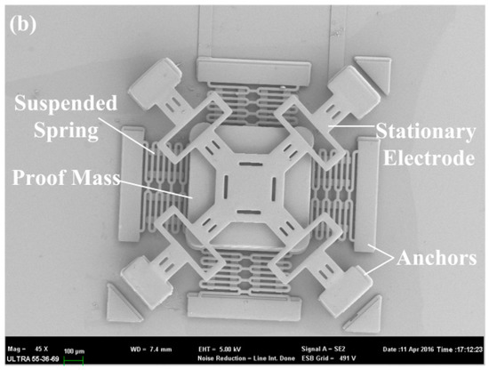 - A gap x2 (15 µm) between the proof mass and the stationary electrode was formed after the anchors which suspend the stationary electrode were electroplated higher (15 µm) than the proof mass.
