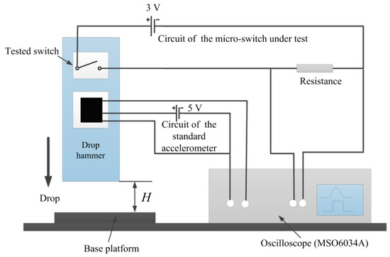 It can be seen from Figure 15 that the drop hammer system was used to test the fabricated device. The standard accelerometer, ADXL-193, which has a sensitivity of 8 mV/g and was made by Analog Devices Inc. in Norwood, MA, USA, can be applied to the calibration. Simultaneously, the output signal was collected by an Agilent 6000 oscilloscope which was made in Agilent Technologies Co. Ltd., Santa Clara, CA, USA. Firstly we can fix the test device and the accelerometer on the dropping table, whose sensing direction is vertical to the base platform. The drop hammer could be dropped freely onto the base platform from different pre-set height H as shown in Figure 14, generating different accelerations which were applied to the test microswitch. It is evident that the amplitude of the acceleration changes with the pre-set height H. The drop hammer can drop freely from a different pre-set height H, and an array of heights correspond to a series of acceleration amplitudes. The amplitude of the acceleration increases with H. The acceleration signal and the trigger signal can be detected by the oscilloscope when the test microswitch switches on.