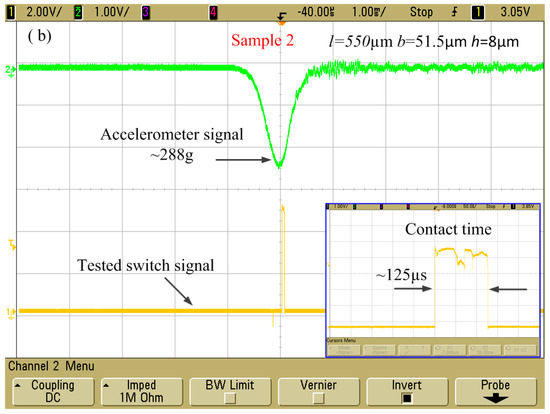 Test results of the inertial microswitches under the shock acceleration amplitude of 288 g: (a) The geometric parameters (l, b, h) of the stationary electrode are 550 µm, 51.5 µm, and 12 µm in sample 1; (b) The geometric parameters (l, b, h) of the stationary electrode are 550 µm, 51.5 µm, and 8 µm in sample 2.