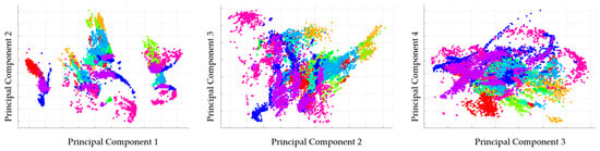 As not all features are equally useful in discriminating between activities, Principal Component Analysis (PCA) is applied to map the original features into a lower dimensional subspace (i.e., new mutually uncorrelated features) , where m ≤ p []. It also significantly reduces the computational effort of the classification process. The PCA components can be counted by X = YP, where X and Y are centering and input matrix, respectively and P is a matrix of eigenvector of the covariance vector matrix Cx = PΛPT. Λ is a diagonal matrix whose diagonal elements are the eigenvalues corresponding to each eigenvector []. The new feature vectors are so-called principal components and arranged according to their variance (from largest to lowest). To keep the essential information in acceleration data that describe human activity, we take the first principal components that explain 95% of the total variance. The pairwise scatter plots of the first four components (transformed features) of one of test cases are given in Figure 2. As expected, the first components (the first component against the second component) for different classes are better clustered and more distinct.