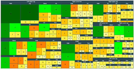 We considered 10 major positions on the body i.e., Waist (W), Right Lower Arm (RLA), Left Lower Arm (LLA), Right Upper Arm (RUA), Left Upper Arm (LUA), Right Lower Leg (RLL), Left Lower Leg (LLL), Right Upper Leg (RUL), Left Upper Leg (LUL), and Chest (C). All sensors positions described in each dataset have been mapped into the major positions. For example, if a subject puts the cellphone in the left front pants pocket, we consider it as Left Upper Leg (LUL) position, or wrist, which is a great place for many commercial wearables, is considered as RLA/LLA in this paper. In this field, numerous studies [,] have shown that the performance of HAR systems strongly depends on sensor placement since the number and the placement of inertial sensors have direct effects on the measurement of bodily motions. Each placement turns out to be more suitable in terms of performance for particular activities. Besides, having fewer sensors attached to the body is more preferable since wearing multiple ones can become burdensome and is not well-accepted. Therefore, we limited our modeling and analysis for single-accelerometer data while we still expect a sufficiently high recognition rate for the picked activities. According to the datasets, the most examined activities (top activities) are walking, running, jogging, cycling, standing, sitting, lying down, ascending and descending stairs which also represent the majority of everyday living activities. Another observation we find is that in eight major positions we have data for all top activities. Therefore, we choose them as target activities for eight separate positions (W, RLA, LLA, RUL, LUL, RLL, LLL and C). We created rectangular tree map that presents dense volumes of data in a space filling layout allowing for the visual comparison of datasets contributions in each target position (see Figure 3). For example, as depicted in Figure 3, datasets 3, 5, 6, 7 and 8 contribute data for constructing the chest dataset with nine activities.