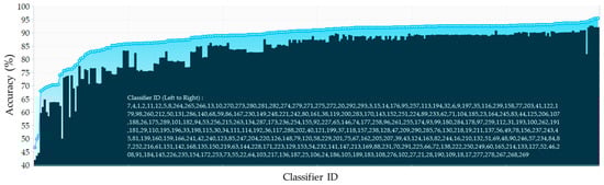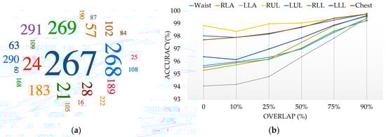 Different studies [,,] show that the use of overlap between successive sliding windows help the classifiers to be trained with more feature vectors and consequently improve the recognition performance. However, it adds more computational work needed to process the overlapped data multiple times. To evaluate the effectiveness of the degree of overlap, the overlaps of 10%, 25%, 50%, 75% and 90% are used where the percentage is the amount the window slides over the previous window. For instance, a sliding window with 25% overlap will start the next window while the previous window is 75% complete. The value can range from 0% to 99%, since a 100% sliding window is erroneous. Figure 9b illustrates the recognition system capabilities for diverse overlap values while keeping the best window size in each position (see Figure 6). The results demonstrate that the performance tendency is increased in most cases by overlapping more data segmentations. An average increase of 3.28% in the best accuracy was found between the 0% and 90% overlap scenarios and all obtained with ensemble of KNN. Figure 10 also illustrates the number of classifiers that provide good results (90%–99%) by considering different overlap sizes. The larger the overlap, the more improvement is expected in performance. As described, this is because more features can be trained and consequently the predictive model almost certainly works better in testing phase; however, it suffers from more training time.