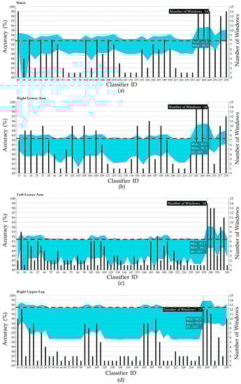 The bar charts in Figure 5 indicate the number of window sizes (1 s to 15 s) in which the topClassifiers provided good results (top 5%). An interesting observation from the bars is that some classifiers such as KNN (Subspace), Tree (Bagging) and SVM work well with most windows sizes. This means they could mitigate the effect of window size to gain meaningful information for the activity classification process. To have a better understanding of window size effect on accuracy, Figure 7 shows the topClassifiers across all window sizes in each position. As can be observed, the interval 3–10 s proves to provide the best accuracies in most cases considering the target activities. This range can be reduced if fusion of multiple sensors is used for feature extraction. Another point worth mentioning that is for the underlying periodic activities, large window sizes do not necessarily translate into a better recognition performance.