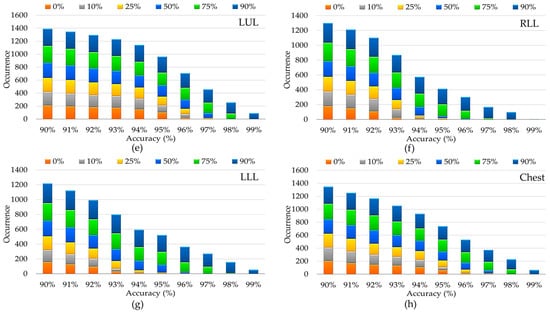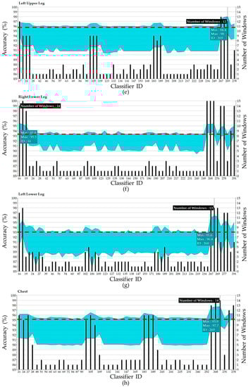 The range of topClassifiers accuracies for (a) Waist; (b) RLA; (c) LLA; (d) RUL; (e) LUL; (f) RLL; (g) LLL; and (h) Chest.