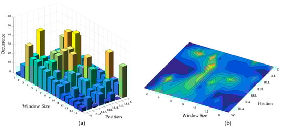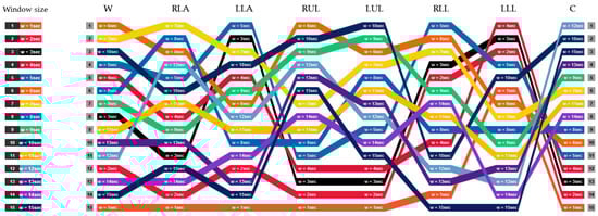 As can be seen in this figure, most of the recognition methods remain consistent in their relative performance across different accelerometer data obtained from different positions. As explained in Section 2, finding the optimal length of window size is an application-dependent task. The window size should be properly determined in such a way that each window is guaranteed to contain enough samples to differentiate similar activities or movements. Thus, we consider different window sizes ranging from 1 s to 15 s in steps of 1 s to ensure the statistical significance of the calculated features. It comprises most of the values used in the previous activity recognition systems []. Figure 6 describes the ranking of different window sizes in providing the best accuracy (among all classifiers) in each position. For example, window of length 7 s provides the best classification accuracy when the sensor is attached on the RLA. The second best accuracy value for RLA is achieved with window size 8 s. The first line in this figure shows the window sizes of the best accuracies for each position. In contrast to LLL where the top four accuracy values have been observed in small window sizes ranging from 2 s to 5 s, chest provides the top-rank accuracy values in large window sizes from 10 s to 15 s. This observation is more highlighted in orange line (w = 1 s) where all positions obtain the worst case accuracy values except for the LLL. However, in some cases we can change the window size (increase/decrease) at the expense of a subtle performance drop. For example, in chest position, the window size can be reduced from 15 s to 7 s by only tolerating 0.16% in recognition performance.