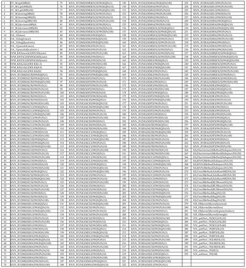 The followings are the list of abbreviations: SC: Split Criterion; MS: Maximum number of Splits; T: Type; KF: Kernel Function; C: Coding; KS: Kernel Scale; P: Polynomial; GA: GAussian; OO: One-vs-One; PO: Polynomial Order; BT: Break Ties; D: Distance; DW: Distance Weight; EX: EXponent; N: number of Neighbors; SM: SMallest; NE: NEarest; RA: RAndom; CB: City Block; CC: ChebyChev; CO: COrrelation; CS: CoSine; EU: EUclidean; SE: Standardized Euclidean; MA: MAhalanobis; MI: MInkowski; SP: SPearman; EQ: EQual; IN: INverse; SI: SquaredInverse; EL: Ensemble Learner; NL: Number of Learners; DI: DIstribution; TF: Training Function; HL: number of Hidden Layers; SCG:: Scaled Conjugate Gradient; RP: Resilient backPropagation; LM: Levenberg–Marquardt backpropagation.
