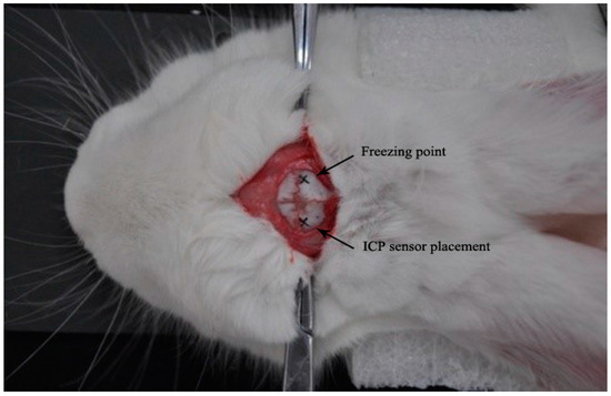 The epidural freezing method that can lead to cerebral edema rapidly [23] was used to establish a cerebral edema animal model that was fixed to the platform of the table by non-magnetic material. The mechanism of the frozen traumatic brain injury model was single, simple, and easy for qualitative research [24]. In the experimental group, rabbits were first injected with urethane (25%, 5 mL) by an ear vein for anesthesia. The hair was removed from the head and then a hole was drilled beside the “cross stitch” of the brain, forming a 5 mm × 5 mm bone window and exposing the dura mater; then, the cryopencil was immersed in liquid nitrogen for a sufficient time and was put into the bone window for freezing. The freezing temperature was −196 °C, the freezing time was 120 s, and the dental cement was used to seal the bone window. Through the experiment, ICP was taken as the reference signal. To embed the fiber optic probe of the Camino MPM-1 intracranial pressure monitor, a hole with a diameter of 2 mm was re-opened in animal models, and the opening and freezing points were axially symmetrized by a sagittal suture. Then, the optical fiber probe was inserted approximately 7 mm into the brain parenchyma and was closed and fixed with gudgeons. The rabbits in the control group experienced the same procedure only without freezing. The freezing point and ICP sensor placement are shown in Figure 3.