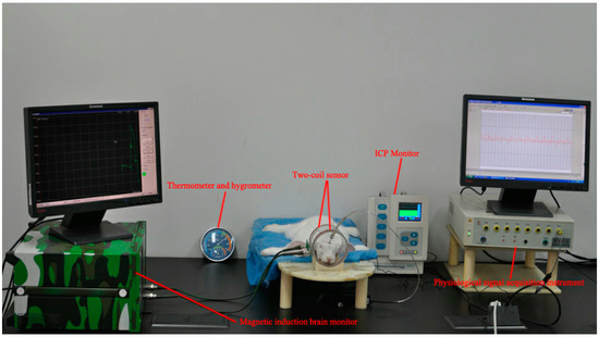As shown in Figure 4, each animal was placed into the coils after the operation. A thermometer and hygrometer displayed the temperature and humidity at real time, and the temperature of the experiment environment was controlled to 21–23 °C, while humidity was maintained at approximately 50%. A physiological signal acquisition instrument (RM6280C, Chengdu Instrument Factory, Chengdu, China) was used for continuously monitoring the heart rate changes in the rabbits. When the heart rate of the experimental animals was regular, a magnetic induction brain monitor and Camino MPM-1 intracranial pressure monitor were used to monitor the 24 h MIPS trends and ICP changes at real time. During the monitoring process, rabbits were intraperitoneally injected with 5 mL of 25% urethane every 2 h; vital signs were monitored to ensure stability.