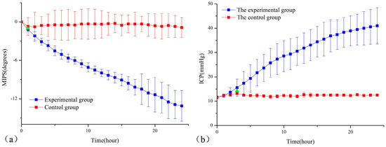 Figure 6a,b represent the mean 24 h trends of the MIPS and ICP of the experimental group (n = 10) and the control group (n = 6), respectively. For the experimental group, the mean MIPS showed a downward trend, while the mean ICP increased continuously. At the 24th hour, the mean ICP and MIPS had the largest change of 41 ± 7.44807 mmHg and −13.1121 ± 2.3953°, respectively. The mean MIPS of the control group had a change of −0.87795 ± 1.5146 degrees at the 24th hour but there was no clear upward or downward trend. The mean ICP of the control group showed a fluctuating trend at 12 mmHg. From this comparative analysis, it agrees with the theory that the occurrence of cerebral edema causes a decline in the electrical conductivity of brains, resulting in MIPS decline [20,27]. As a gold standard for monitoring cerebral edema, the ICP can reflect intracranial cerebral edema through indirect measurement [3]. The overall upward trend of the ICP in the experimental group indicated that the cerebral edema became increasingly severe within 24 h after the occurrence of cerebral edema. The 24th hour BWC results, as shown in Table 1, were analyzed with bilaterally independent t-tests, and the p-values were less than 0.05, indicating significant differences between the experimental and control groups. This can demonstrate that rabbits in the experimental group indeed had severe cerebral edema at the 24th hour, while rabbits in the control group almost did not have cerebral edema. The MIPS trend in this work is basically capable of monitoring gradual increases in the cerebral edema solution volume.
