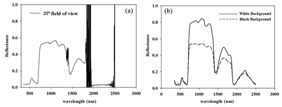 The characteristics of reflectance spectra of pear leaves by in-field spectral measurements using the 25° field of view (a); and either black background or white background (b) using the leaf clip.