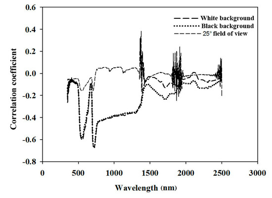 Except for the low correlation of reflectance obtained by the 25° field of view method, the remaining two methods were relatively highly correlated with the leaf N concentration. In addition, the N concentration was highly correlated with the reflectance regions of 500–640 nm and 690–1380 nm. In the visible and near-infrared band (350–1100 nm), the correlation between the reflectance and N concentration of the methods with white and black backgrounds was similar, whereas the spectral reflectance measured by the black background better reflected the correlation with the leaf N concentration than that measured by the white background in the short-wave infrared band (1500–2500 nm).