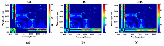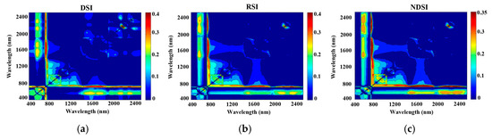 Contour maps of coefficients of determination for the linear relationship between the three vegetation indices (difference spectral index (DSI, a), ratio spectral index (RSI, b), or normalized difference spectral index (NDSI, c)) and chemically-measured leaf N concentration using the spectra measured by the black background.