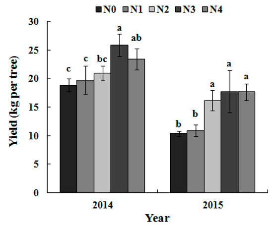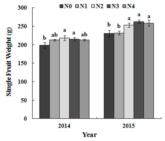 Single-fruit weight and the yield increased at first and then decreased with the N application rate in 2014. However, no significant increase was found in yield and single-fruit weight with an increase in the N application rate beyond N2 in 2015 (Figure 7 and Figure 8).