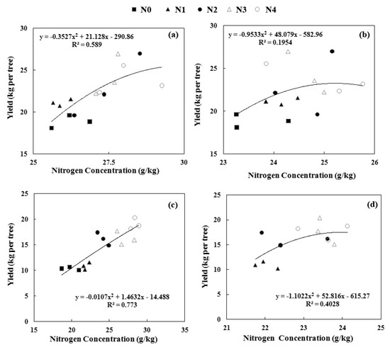 Relationship between the chemically-measured leaf N concentration and the fruit yield. Leaf samples collected in May (a) and June (b) 2014 as well as May (c) and June (d) 2015. Each point is an average of three trees.