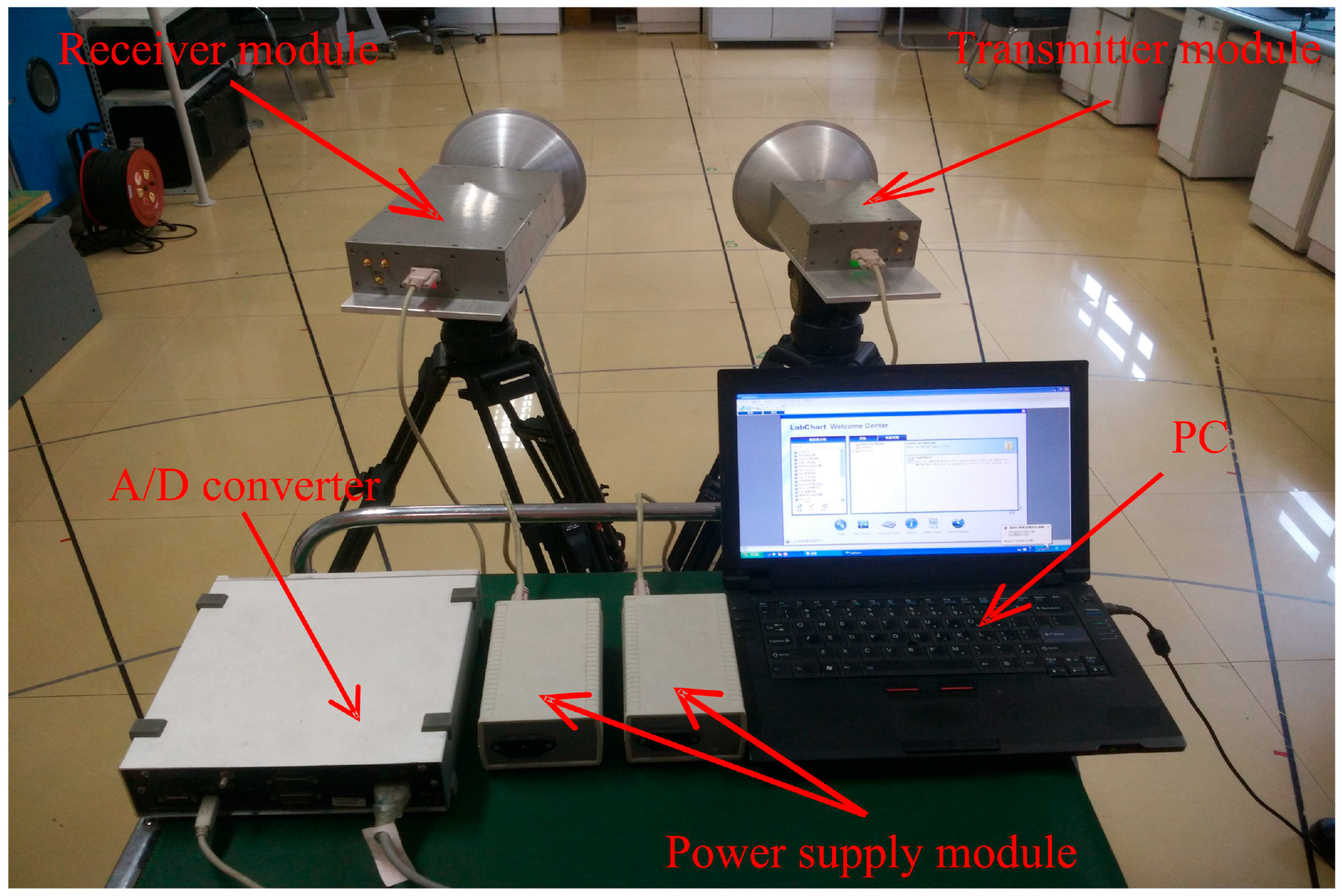 The receiver and transmitter module are separate; they are each installed on a tripod equipped with a rotating head to enable alignment in any direction (Figure 1). The structure of the two separate antennas provides a high directivity gain, which can effectively increase the detection range and reduce the interference between antennas. Further, the structure enables the distance and angle between the two antennas to be easily adjusted, when directed to a target. Both the transmitting and receiving antennas are of the Cassegrain type with diameters of 200 mm each (ECA-W-10-200, ELVA-1 Company, St. Petersburg, Russia). The beam width is 1° × 1° at the –3 dB level in both horizontal and vertical directions. The operating wavelength is 3.19 mm. The waveguide band is WR-10, which is within the millimeter-wave atmospheric transmission window. Therefore, it can provide low propagation losses over long distances, when monitoring subtle physiological movements [22].