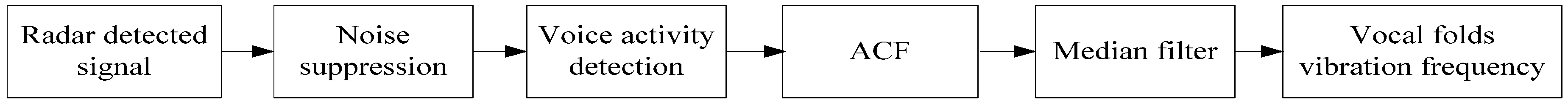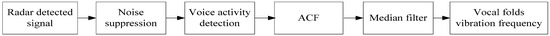 The oscillation signal (pitch frequency) of the vocal folds is controlled by laryngeal mechanics and aerodynamic properties [28]. The vibration frequency of the vocal folds is one of the most important parameters in the voice signal; moreover, it describes an important feature of the speech excitation source. Therefore, the extraction of the vibration frequency of the vocal folds from the radar-detected signal is an important approach to evaluate the radar performance in the detection of the human vocal fold vibration. Further, a good estimation of the vibration frequency of the vocal folds is crucial for improving the performance of speech analysis and synthesis systems. The pitch frequency range of a normal voice signal is between 50 and 500 Hz [29].