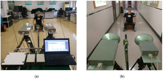 The experiments were divided into two scenarios. The first scenario was in an enclosed room, as shown in Figure 4a. The second scenario was in a corridor. In these experimental scenarios, a 27-year-old male subject was located in front of the radar detection system. A microphone was placed on his throat at the same height as the radar antennas. Simultaneously, a vibration measurement sensor was adhered to the skin over the larynx. This sensor was used for acquiring the vocal vibration signal, particularly for detecting the vibration signal of the vocal folds.