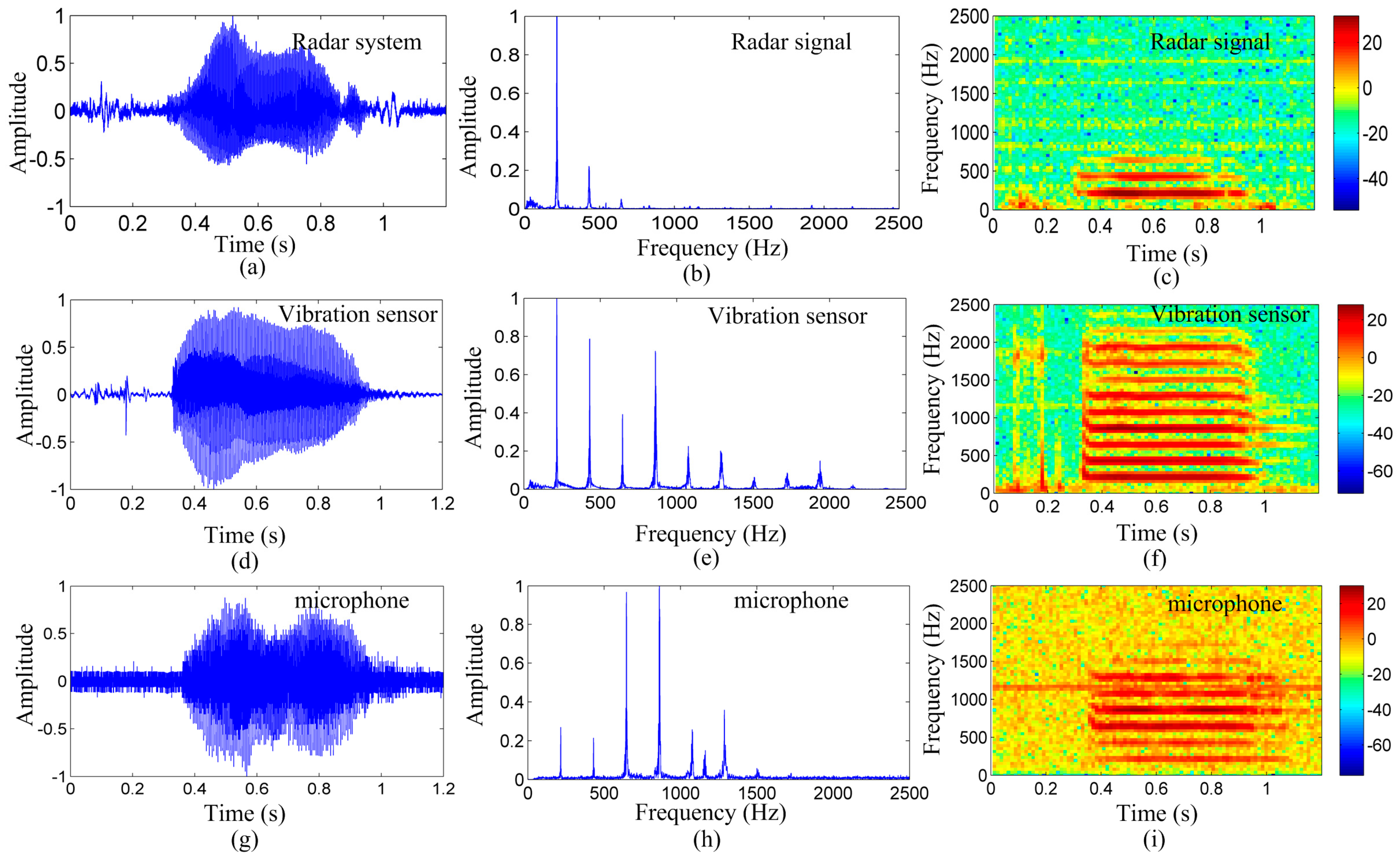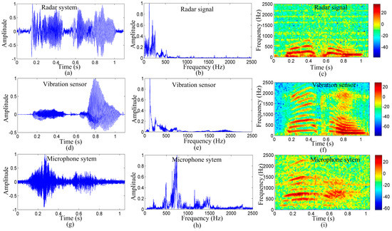 As shown in Figure 8c,f,i, we can determine that the noise of the signal detected by the radar is less than that of the signal detected by the microphone. The low-frequency component, particularly, the fundamental frequency, is lost because of the long distance. However, as demonstrated by the frequency-domain information, the energy of the vocal-fold vibration frequency signal is very high for the radar and vibration sensor, particularly, for the signal detected by the radar. Figure 8b,e,h show that the vocal-fold vibration frequency of the signal detected by the radar and vibration sensor are the same, and are different from that of the signal detected by the microphone.