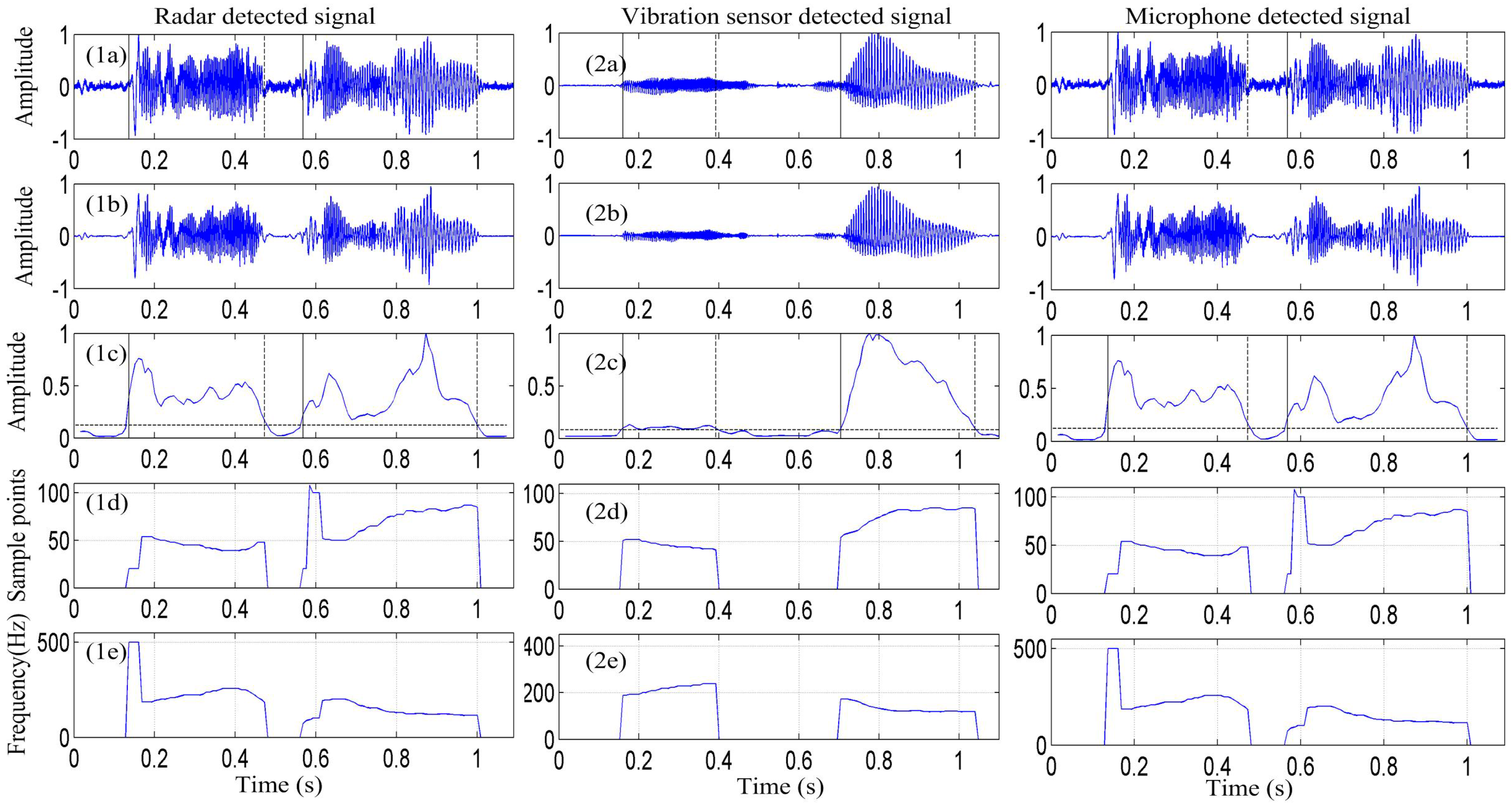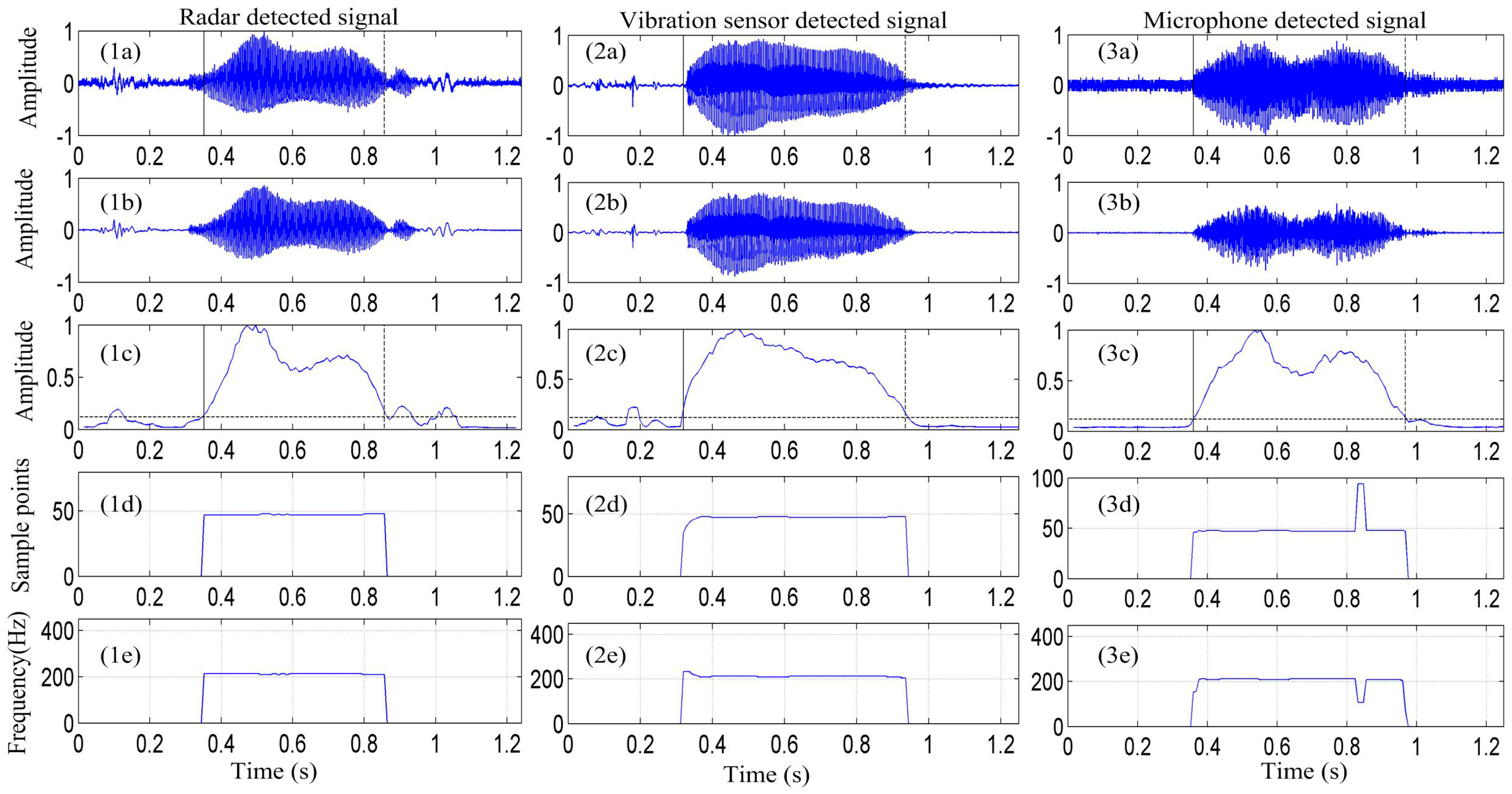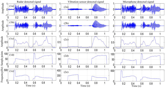 Figure 6(1a–3a) show the signal of the /a/ sound is detected by the radar, vibration sensor, and microphone, respectively. Figure 6(1b–3b) depict that the signal is enhanced by the EMD algorithm. Figure 6(1c–3c) present the signal-activity detection result. Figure 6(1d–3d) show the pitch-period contour of the detected signal obtained using the EMD-ACF algorithm, and Figure 6(1e–3e) depict the corresponding vocal-fold vibration frequency.