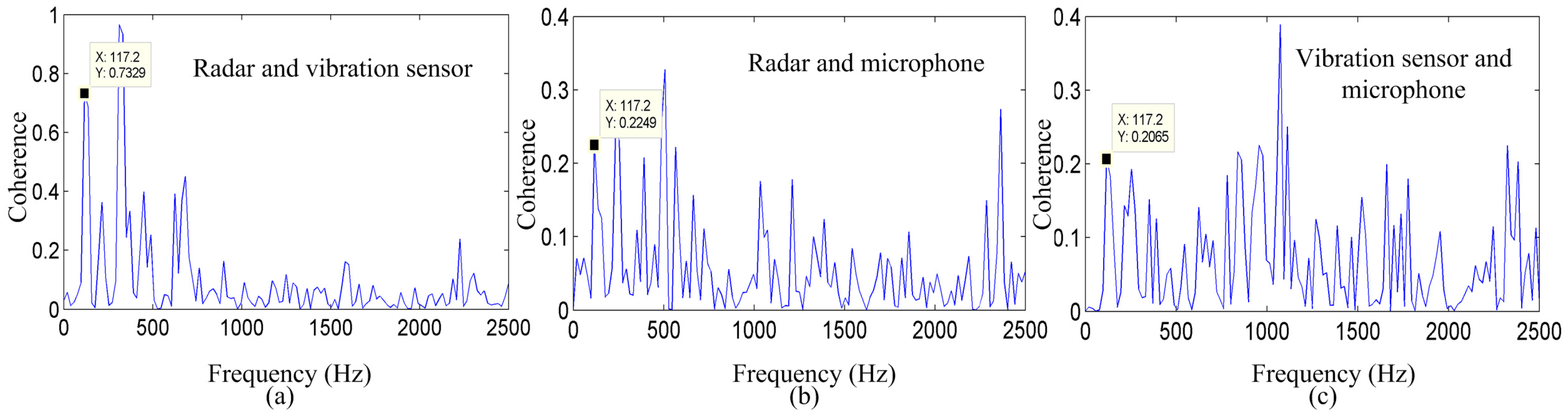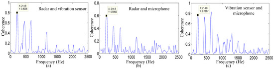 Coherence between the three measurement methods for the spoken word “welcome.” Coherence between the signals detected by the (a) radar and vibration sensor; (b) radar and microphone system; and (c) vibration sensor and microphone system.