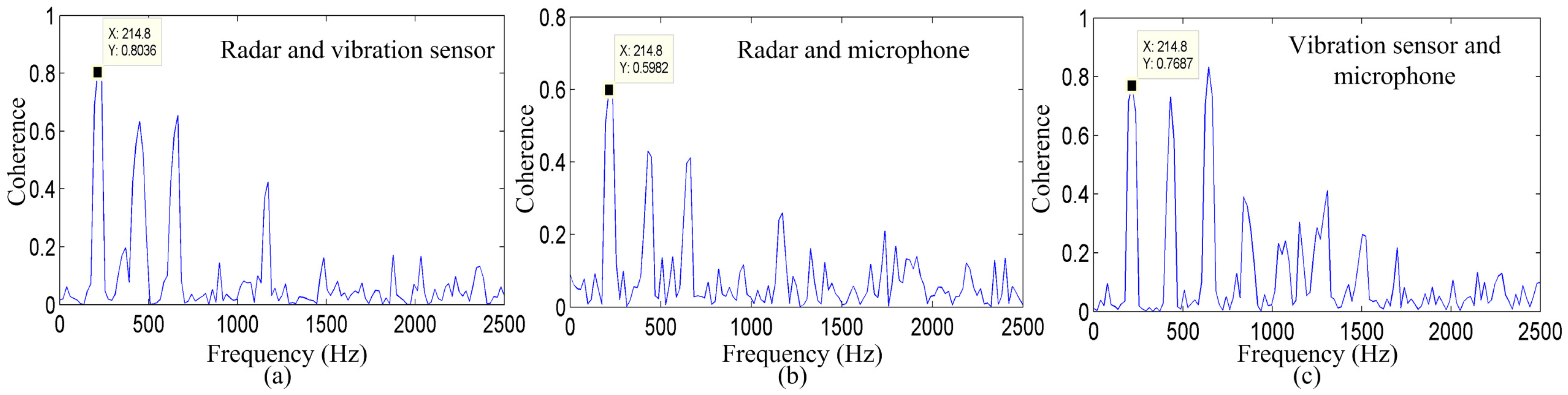 Figure 7 shows the coherence between the radar system and microphone system, the radar system and vibration measurement sensor, and between the microphone system and vibration measurement sensor for the vowel sound /a/. Significant coherence is evident in the vocal-fold vibration frequency and in some harmonics, among the three measurement methods that exhibit a peak in the spectra at approximately 214.8 Hz. This peak must be the vocal-fold vibration frequency.