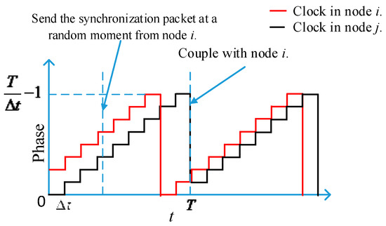 In the discrete phase, each node is characterized by a cycle-count timer k (the period is T). Assume that Δt is a short duration of time which denotes the resolution of timer and T can be divided exactly by Δt. The timer k increases by one for each Δt. Thus, in each node, the local timer k can be expressed as a discrete phase, which consists of a series of moments t and: