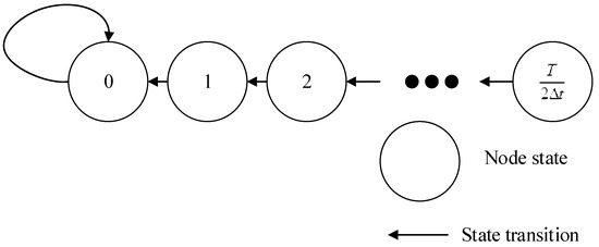 Suppose the state is n (n ≥ 1). After one step transition, the state will be n − 1 according to the Equation (31). And if the state is 0, after one step transition, the state will always be 0. Since the max of state is T/2Δt in Equation (30), after T/2Δt steps, the state will be 0 constantly and the probability of it will be 1.